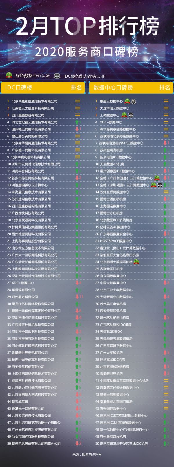 2020年3月2日 ,服务商点评网发布了2020年2月的数据中心、云计算领域的服务商口碑排行榜Top50,包括IDC企业和数据中心口碑排行。该排行榜的排名通过绿色数据中心认证和IDC服务能力评估认证。