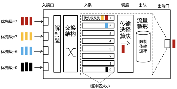 调度整形机制是交换机中的两种服务质量保障机制,调度是指队列调度,一般实现在交换机的出端口,包含进入队列、根据调度算法选择发送队列、出队传输三个部分;整形是指流量整形,通过限制端口的转发速率从而防止交换机内部或下一跳出现拥塞。