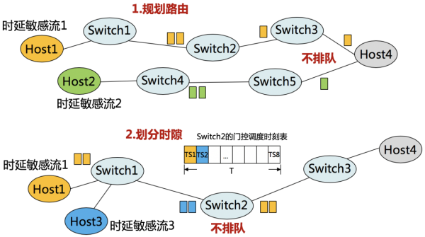 那么时延敏感网络如何才能实现低时延呢?首先,网络的每跳时延可分为链路传播时延、交换机处理时延、出端口排队时延三部分,而端到端时延为逐跳时延求和。链路时延和处理时延基本为固定值,所以减少时延必须要减少排队时延,即时延敏感网络的本质就是不排队:先通过优先级队列将时延敏感流和尽力而为流隔开,再从时间上(划分时隙)或空间上(规划路由)将同样的时延敏感流隔开。